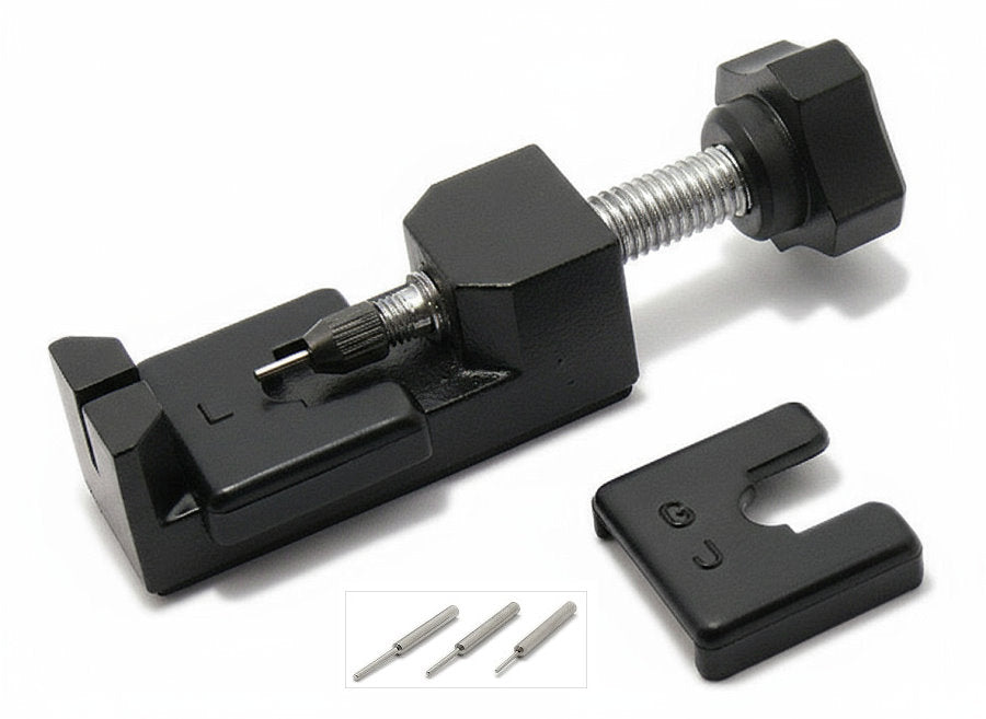 Einfache Handhabung: Durch Drehen der Schraube werden die Splinte der eingespannten Metall-Uhrenarmbänder ausgetrieben. So können Sie ohne lästige "Fummelei" einzelne Glieder des Bandes entfernen. Nach dem Entfernen nur noch das Uhrenarmband durch Wiedereinführen der Splinte mittels Hammer etc. wieder zusammenfügen. Fertig!